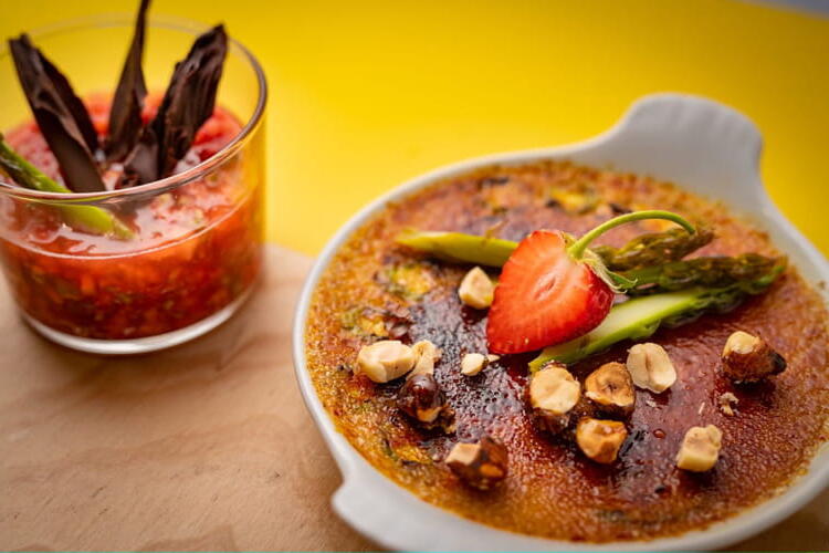 Discover a recipe for crème brûlée with asparagus and caramelized hazelnuts, strawberry tartare, and chocolate shavings, perfect for an original dessert. This recipe, featuring white asparagus, hazelnuts, strawberries, dark chocolate, and lemon, is as simple as it is delicious.