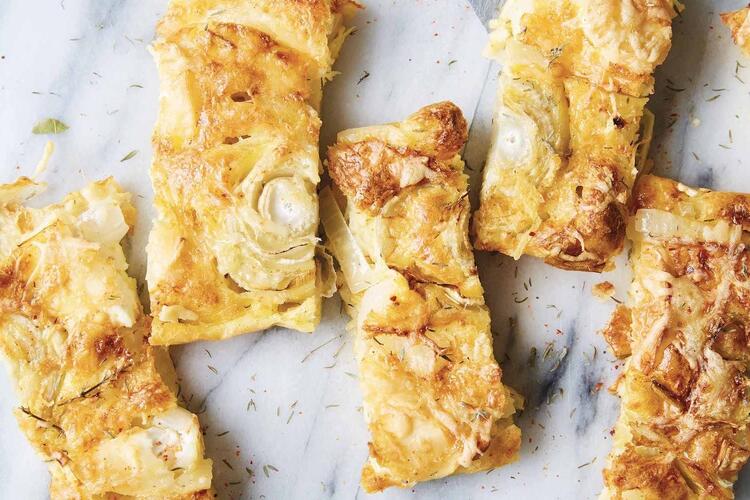 In a previously greased tart pan, arrange the endives and onions, then the slices of goat cheese. Pour the cream mixture over and evenly distribute the grated cheese.