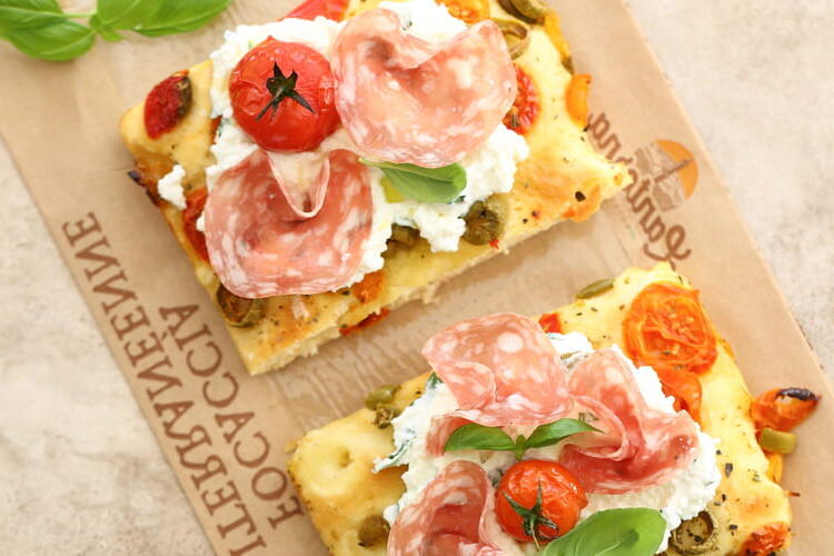 Discover this recipe for focaccia with ricotta and salami. A real treat for the taste buds that is very easy to make for an appetizer or a starter.