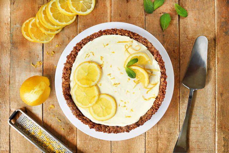 To finish At the moment of serving, remove the tart base from the mold and top with the lemon yogurt cream. Decorate the tart with a few slices of lemon, zest, and a bit of mint.