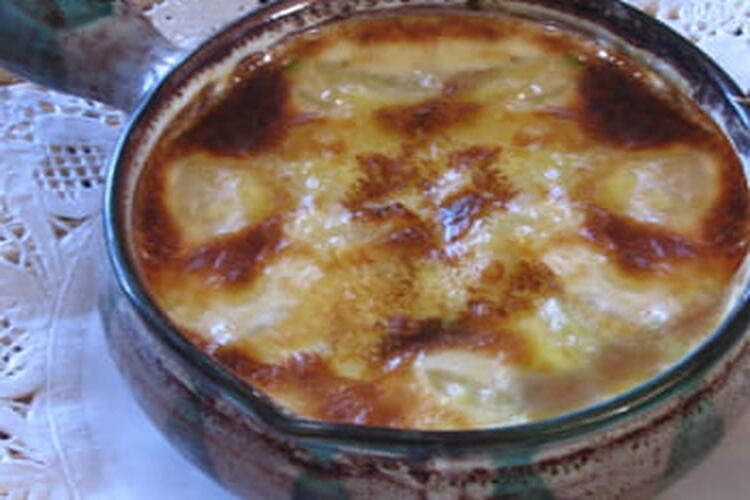 Cut 12 thin slices of cheese. Cut the remainder of the cheese into small cubes and melt them in a saucepan with cream over very low heat. When the cheese has melted, blend everything, season with salt, pepper, and nutmeg.