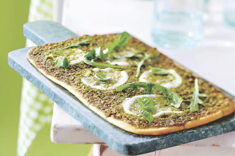 Blend the pistachios until you obtain a fine powder. Set aside. Blend the cheese with the pesto.