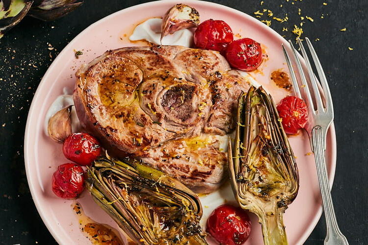 Recipe for Grilled Lamb Leg Slice with Lemon and Roasted Artichokes