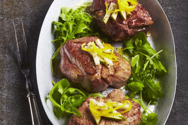 Recipe for Lamb Chops with Pear and Candied Lemon.