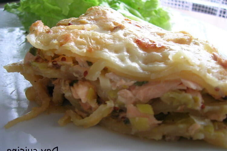 Butter a 20*20 cm baking dish, place 2 sheets at the bottom, then add the leek and salmon mixture. Repeat this step again and finish with a layer of lasagna.