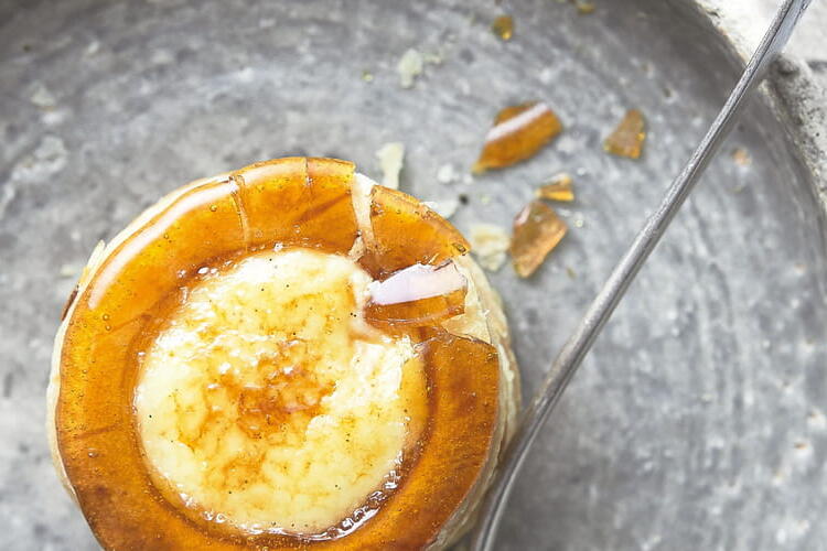 Prepare the caramel by cooking sugar in 4 tablespoons of water, adding lemon juice. Dip the edges of the wells in the caramel and turn them over to let them cool. Fill them with cream, forming a dome. Sprinkle the surface with granulated sugar, which you can caramelize by either applying a heated iron to the surface in a crisscross pattern or by broiling for 1 minute while carefully monitoring the color. Enjoy cold the same day, and keep them cool before serving.