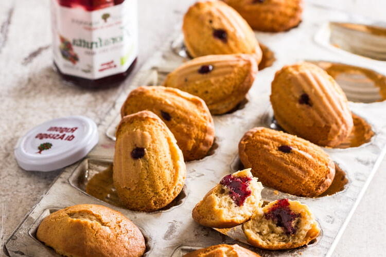 When you take them out of the oven, let them rest for a few moments, then gently remove the madeleines and fill the center with a bit of berry jam using a piping bag.