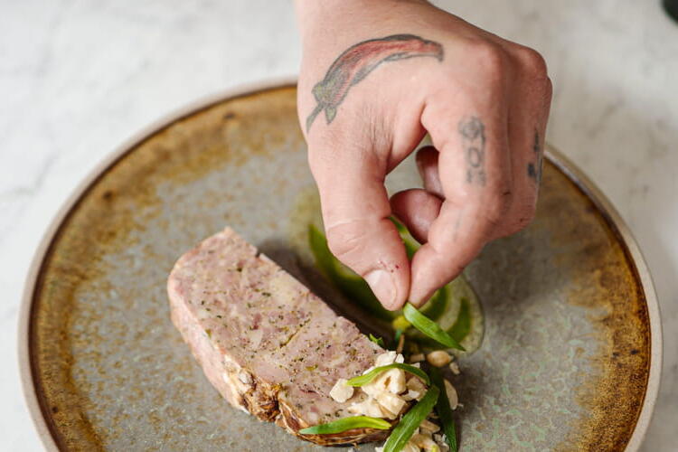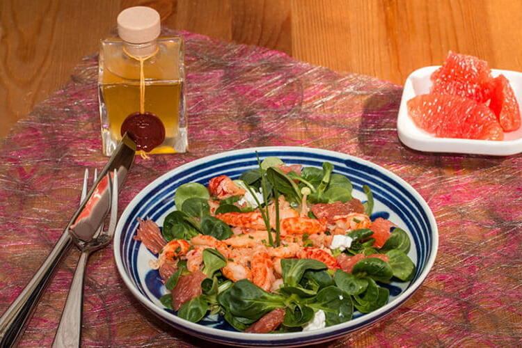 A canapé with marinated shrimp and grilled chorizo, perfect for your New Year's Eve party.