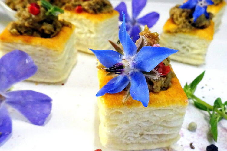 Hello to all of you. I invite you to enjoy these mini square puff pastries filled with eggplant caviar. Very easy to make for an appetizer or a starter. Great for a gathering with friends or family.