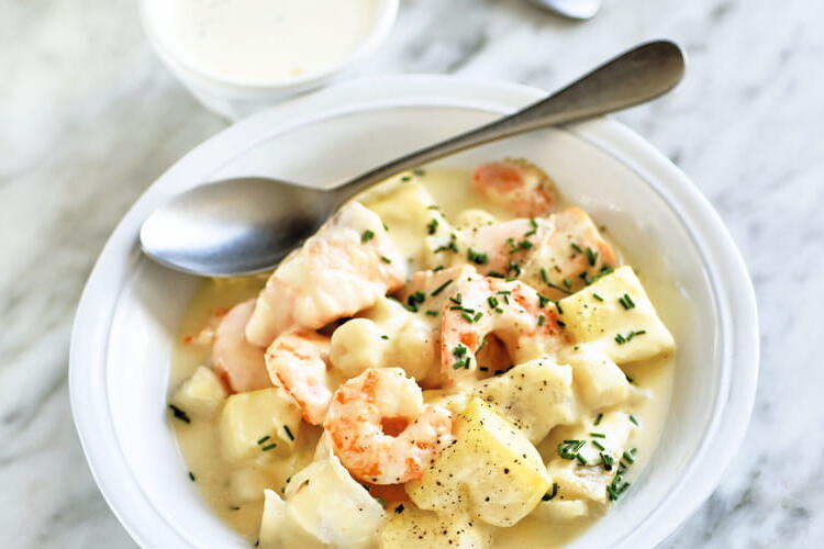 Add 350 g of water and the fish stock cube. Place the cooking basket and put the fish fillets cut into cubes in it. Add the steaming tray and place the mushrooms on it. Place the shrimp on the steaming tray and cook for 20 minutes/steaming temperature/reverse direction/speed 1, then remove the steaming tray and the cooking basket. Set aside the fish, shrimp, and mushrooms.