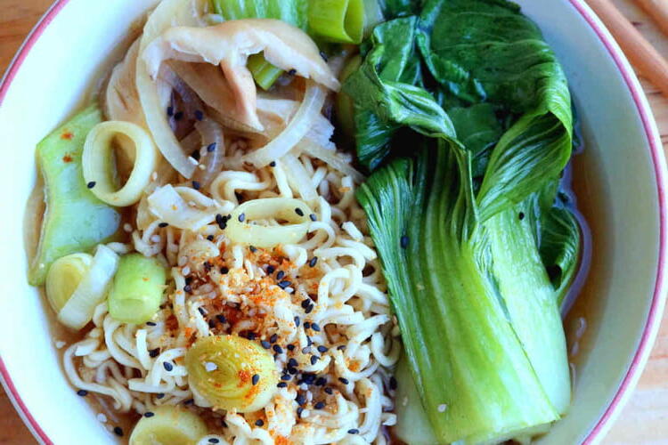 Add the remaining broth over the vegetables. Pour a good splash of tamari sauce and fish sauce. Let cook on low heat for 10 minutes. Before serving, add the green leaves of bok choy and dehydrated Chinese noodles.