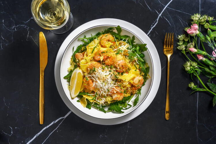 To finish, just before serving, add half of the cheese and breadcrumbs to the skillet. Place the arugula in shallow plates and serve the pasta and shrimp on top. Sprinkle with the remaining cheese and breadcrumbs. Squeeze the juice of 1/4 lemon over everything or sprinkle with the remaining zest if desired.