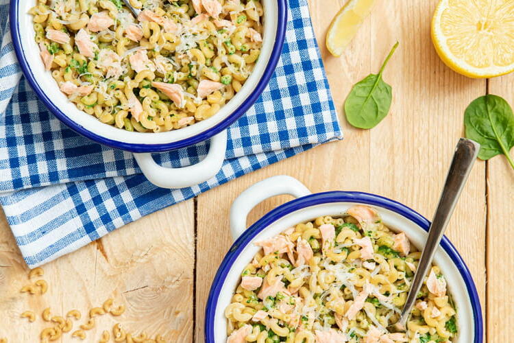 To finish, serve the pasta by mixing it with the spinach cream and the flaked salmon.
