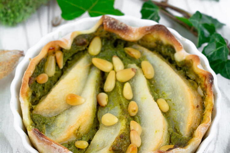 Here is a green tartlet with spinach and pear pesto, on a buckwheat flour crust. It's indulgent and light.