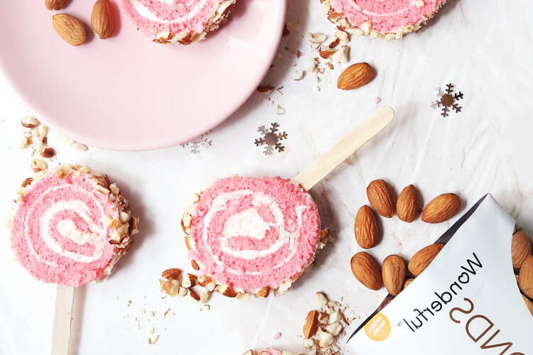 And what if we revisited the traditional holiday dessert? Let's dare to make a deliciously rose-flavored log presented in the shape of lollipops! A recipe suggested by Wonderfuls Almonds. Photo credit: Wonderfuls Almonds, Pear and Cactus.