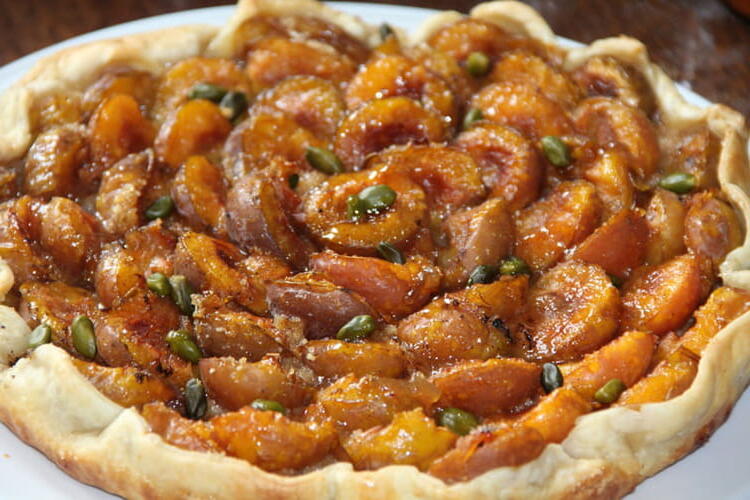 Bake for 30 minutes, monitoring and turning the tart. Wait 5 minutes with the oven off before taking it out. Place it to cool on a rack. Once it has cooled, remove it from the mold, place it on a serving dish, arrange the pistachios, and cover it with apple jelly for a shiny effect.