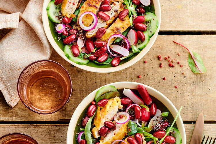This recipe for red bean salad with black quinoa and breaded chicken with almond flour is presented by a brand.