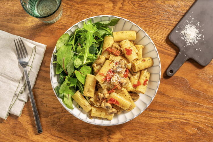 Enjoy this delicious vegetarian recipe of rigatoni with pesto and mushrooms. Easy to prepare, indulgent, and rich in flavors, this recipe will delight the taste buds of both young and old.