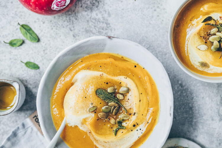 Creamy, smooth, gentle, and comforting... Here’s the recipe for a squash and roasted apple soup to boost your vitamins!