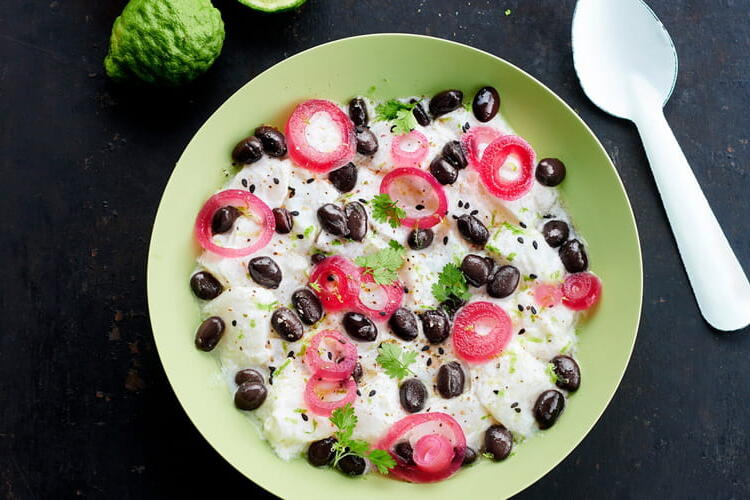 Mix the orange zest, garlic, and herbs. Add the butter, mustard, breadcrumbs, cheese, and a tablespoon of roe. Spread the mixture evenly to a thickness of 3 mm between two sheets of parchment paper. Place in the freezer for about 30 minutes.