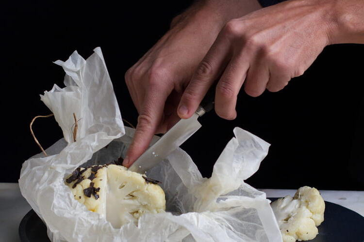 Dry the cabbage well, then brush it with coconut oil and season with salt. Wrap it in a piece of parchment paper with half of the truffle trimmings, then place it on a baking sheet and bake for 45 minutes to 1 hour, until the cauliflower is colored and tender.