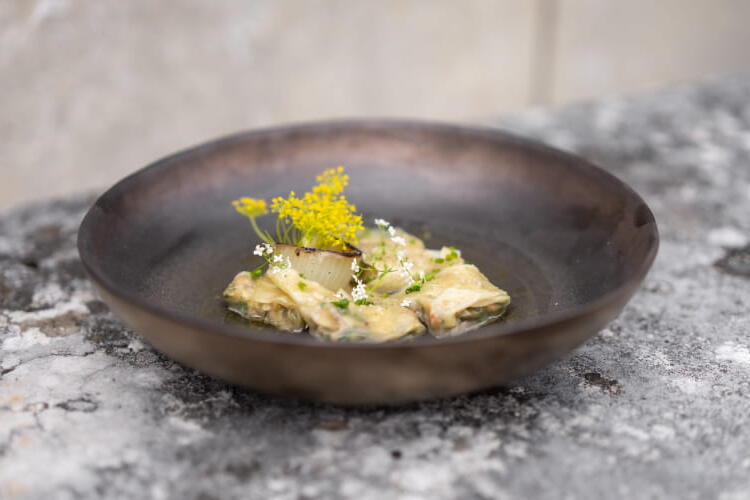To finish For the plating: place a few ravioli at the bottom of the dish, a tablespoon of broth.