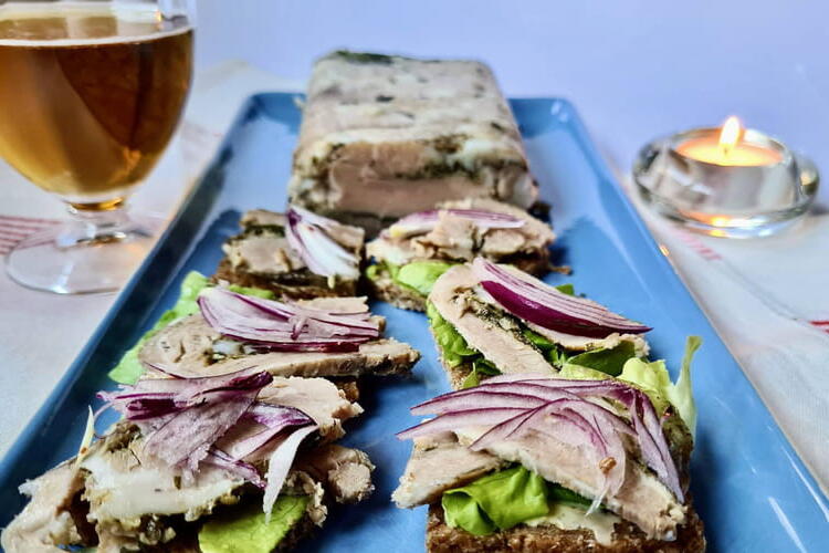 This Danish family-style cured meat is a piece of pork belly wrapped around a parsley mixture, cooked in a broth before being pressed under a weight. It is served in slices on small squares of traditional dark bread with a slice of sweet and sour pickle, a hint of pickled red cabbage, or a thin slice of onion, etc.