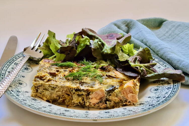 To finish, add the diced salmon, the leek fondue, the chopped dill, the cornstarch (a simple precaution to help the mixture hold together, but not necessary) and mix. Pour the mixture into the baking dish and bake for 25 minutes. Leave it in the hot oven for an additional 15 minutes. Serve with a green salad.