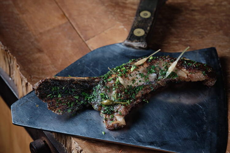 To finish, place the risotto on a plate using a round mold. Drizzle with truffle olive oil, add some truffle shavings and parmesan flakes. Arrange the skewers and drizzle with the beurre blanc sauce. Finally, add the potatoes and garnish with chopped parsley.