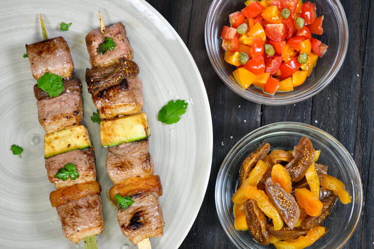 Indulge in this recipe for organic duck fillet skewers served with zucchini, figs, and apricots.