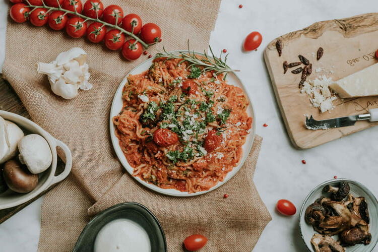 This spaghetti recipe with tomato sauce, ricotta, and zucchini is proposed by Happy Food.