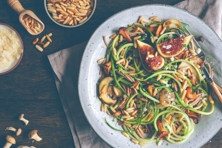For the preparation, start by cooking the whole wheat spaghetti. Prepare zucchini spaghetti using a vegetable cutter. Peel the garlic cloves and slice them. Clean the mushrooms and cut them if they are too large.