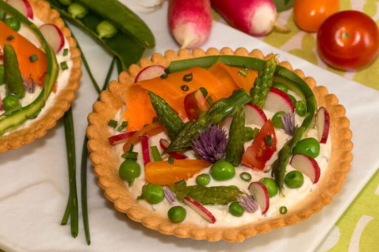 To finish, fill the bottoms of the tartlets with goat cheese cream with chives, smoothing the surface with a spatula. Arrange the vegetables harmoniously. Sprinkle with chives and chive flowers. A fresh and gourmet starter!
