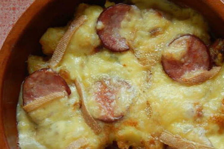 Preparation and Baking Butter a baking dish, add the mixture. Arrange the slices of sausage and cover with cheese slices. Bake in a preheated oven at 200 °C (400 °F) and let brown for 15 to 20 minutes depending on your oven.