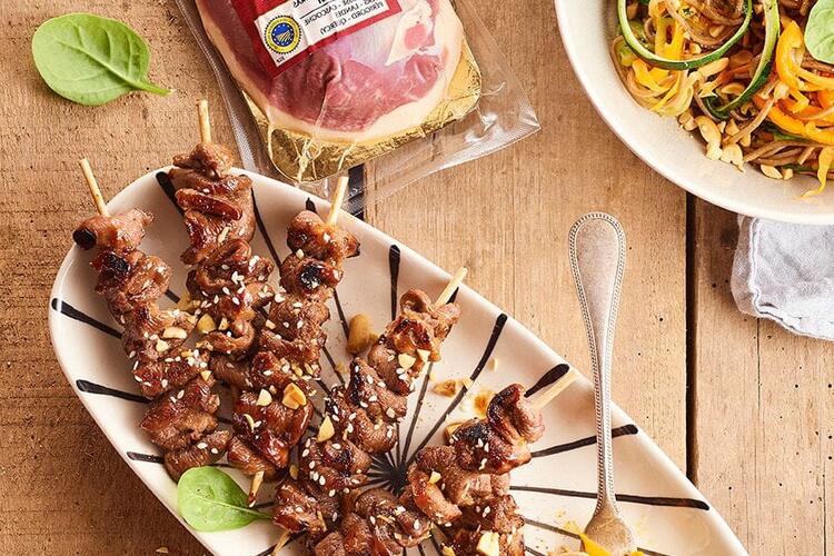 Cook for about ten minutes, stirring regularly. Then add the soba noodles, season with salt and pepper, and continue cooking for 5 more minutes. Skewer the marinated duck pieces onto skewers, making sure to pack them tightly.
