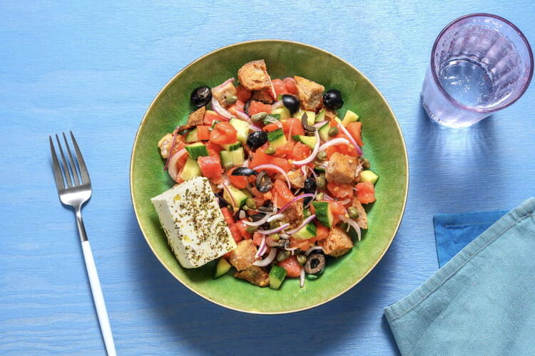 Discover a fresh and flavorful salad: a Tomato & Feta Salad, enhanced with capers, cucumber, and croutons. A perfect combination of Mediterranean flavors that will delight your taste buds.