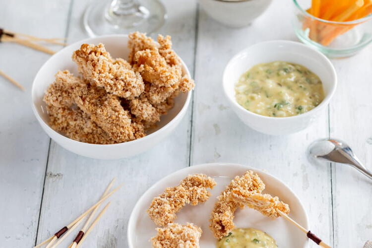 Heat the frying oil to 180°C. Dip the pieces of veal in the flour mixture. Then coat the veal in breadcrumbs before frying it in the hot oil. Work in small batches.