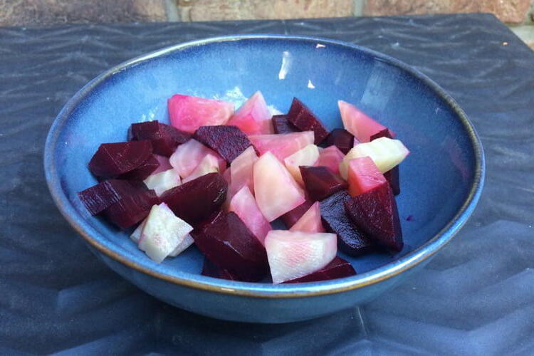 Cut the half zucchini into small dice, wash, dry, and chop the mint. Season this mixture with a drizzle of olive oil, salt, pepper, and lime juice.