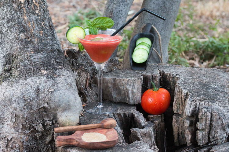As a starter or in a cocktail, refreshing, healthy, and original, it's the cocktail of the summer!!! Tomato juice, cucumber juice, basil, celery salt, garden basil. It's a recipe of my invention, and everyone loves it, including vegans. It's simple, it's delicious, it's healthy, and it's inexpensive. It pairs wonderfully with beautiful summer evenings.