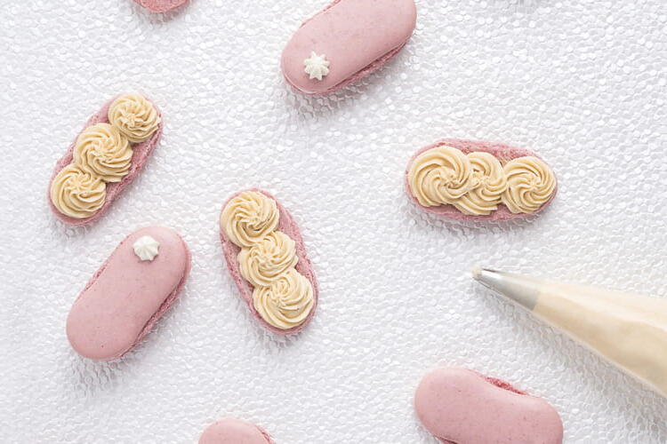Using a piping bag fitted with a plain tip about 7 mm (½ inch) in diameter, shape éclairs (elongated macarons) approximately 7.5 cm (3 inches) long and place them on the prepared baking sheets. Tap the sheets flat on a work surface two or three times to help the éclairs slightly collapse.