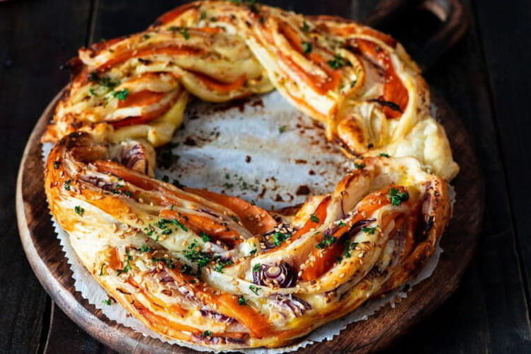 Nothing is simpler than this puff pastry pie, styled like a babka, filled with salmon, onions, and cheese. It always makes an impression when it arrives at the table.