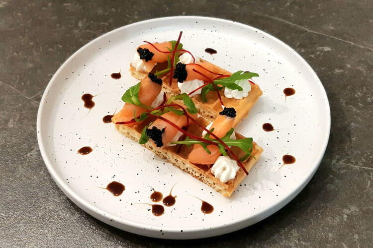 To finish, plating the waffles: Cut the waffles in half and place them on the serving plate, offsetting them. Add a little whipped cream. Slice the salmon, roll the slices, and place them partially on the whipped cream and the waffle. Add eggs to the ends of the salmon rolls. Arrange the salad leaves and beetroot nicely. Drizzle a few drops of vinegar around and add small toothpicks. Just before serving, add a drizzle of lemon over the half waffles.