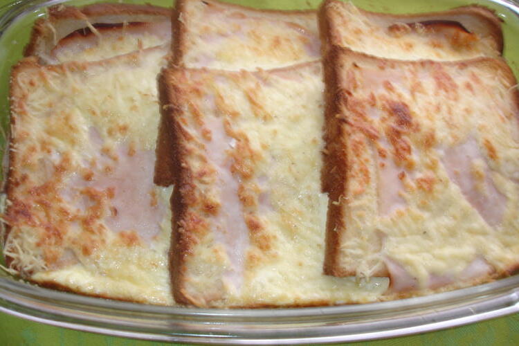 Lightly butter the slices of bread and arrange them in the dish, overlapping them and placing half a slice of ham on each slice of bread. Finish with a slice of bread on top.