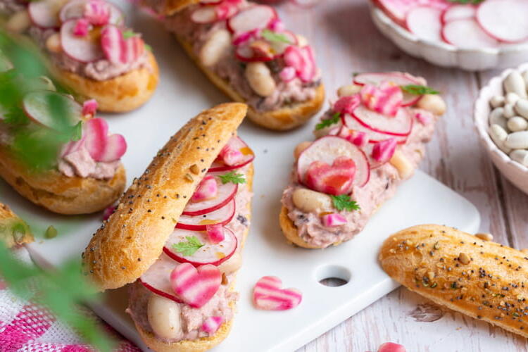 Here is the recipe for pink savory éclairs, perfect for lunch or a brunch. This recipe made with white beans, beetroot, tuna, and fresh herbs is as easy to make as it is beautiful to look at.