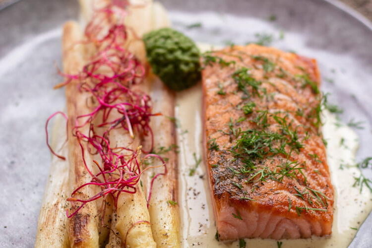 To finish, serve the pancakes accompanied by this mixture, some asparagus, and radishes. A bit of mixed greens will complement the dish.