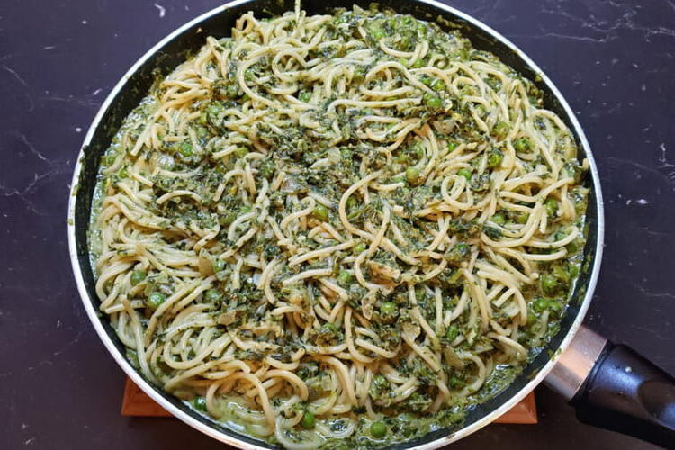 Today I offer you a vegetarian dish or an upgraded side – spaghetti with spinach and peas, accompanied by a creamy pesto-flavored sauce. A delicious pasta dish that is inexpensive, easy, and quick to make. A great way to get picky eaters, especially children, to eat spinach.