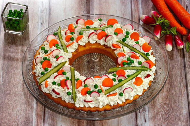 Decoration Mix the cheese with the liquid cream, then place everything in a piping bag fitted with a nice nozzle. Pipe the mixture over the entire surface of the tart. Decorate the tart with the vegetables in a harmonious way. Refrigerate.