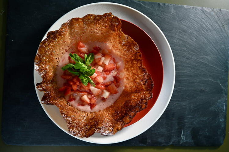 To finish, place the tile in the center of the plate, add the candied strawberries at the bottom, fill three-quarters with cream, and top with the strawberry tartare.