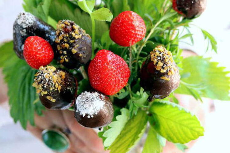 Dip each strawberry in melted chocolate. Dip the tips of the strawberries in shredded coconut or roasted pistachios or other toppings. Place the skewers with strawberries in a glass to let each fruit dry properly. Enjoy.