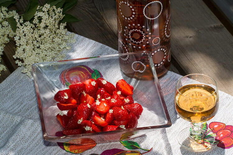 Pour over with elderberry wine. Mix everything together. Place in the refrigerator for about twenty minutes. Note: The strawberry salad should not be too cold, to preserve the full flavor of the fruits.